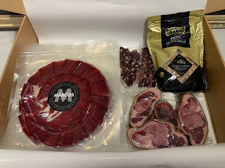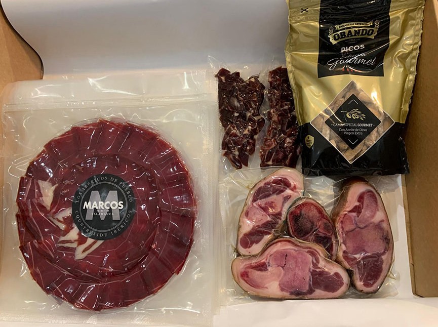 Excelente lote gourmet con 15 sobres de jamón de bellota 100% ibérico, elaborada con carne de cerdo ibérico. Incluye huesos, taquitos de jamón y picos gourmet Obando, ideal para disfrutar o regalar.